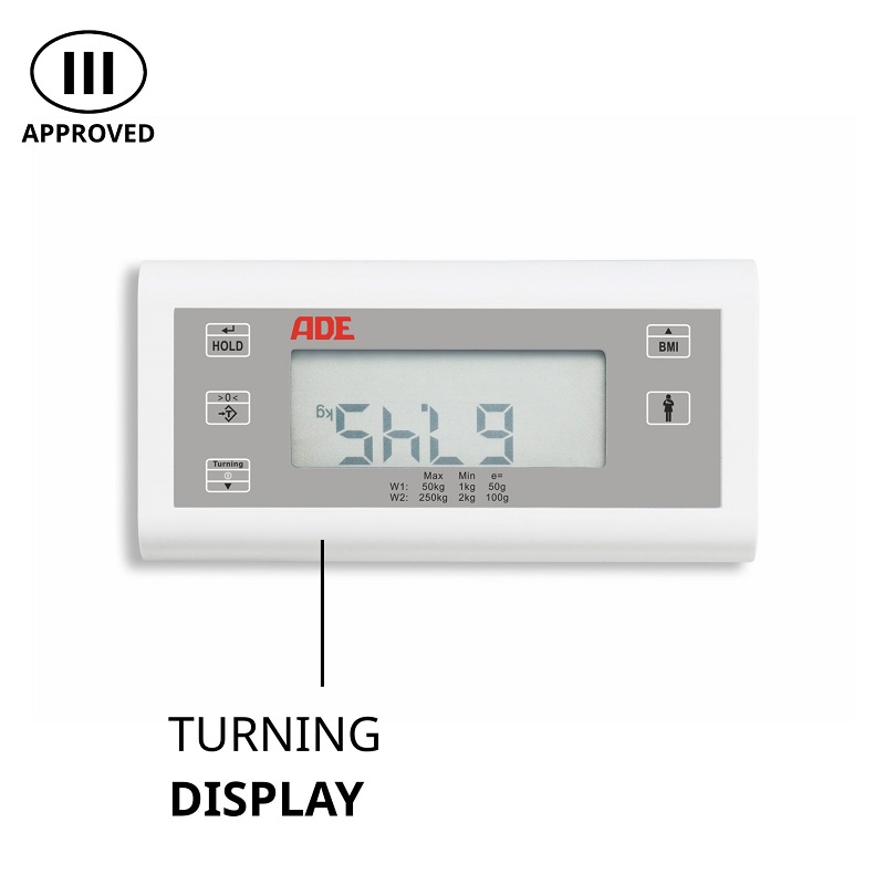 The perfect choice in all medical fields. Heavy-duty electronic column scale with an extra-wide, flat, and slip-resistant platform. The transport castors ensure easy movability. The BMI, hold and mother-child functions provide fast and clear results of the patients’ nutritional condition. The turnable display allows easy reading from the patient and user side. The scale operates by mains and batteries, included as standard. The scale setup is fast and easy: supplied in just two parts and assembled by one set of special screws.