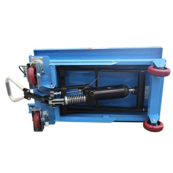 The poly steel wheels are designed to provide exceptional maneuverability in tight areas. This lift table uses a standard handle with a lift release lever and the foot pedal powers the hydraulic lift.